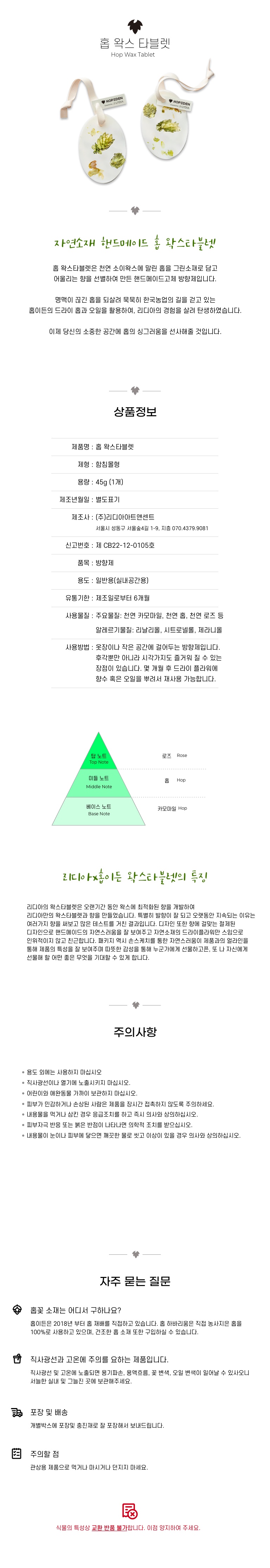 홉 왁스타블렛은 천연 소이왁스에 말린 홉을 그린소재로 담고 어울리는 향을 선별하여 만든 핸드메이드고체 방향제입니다.